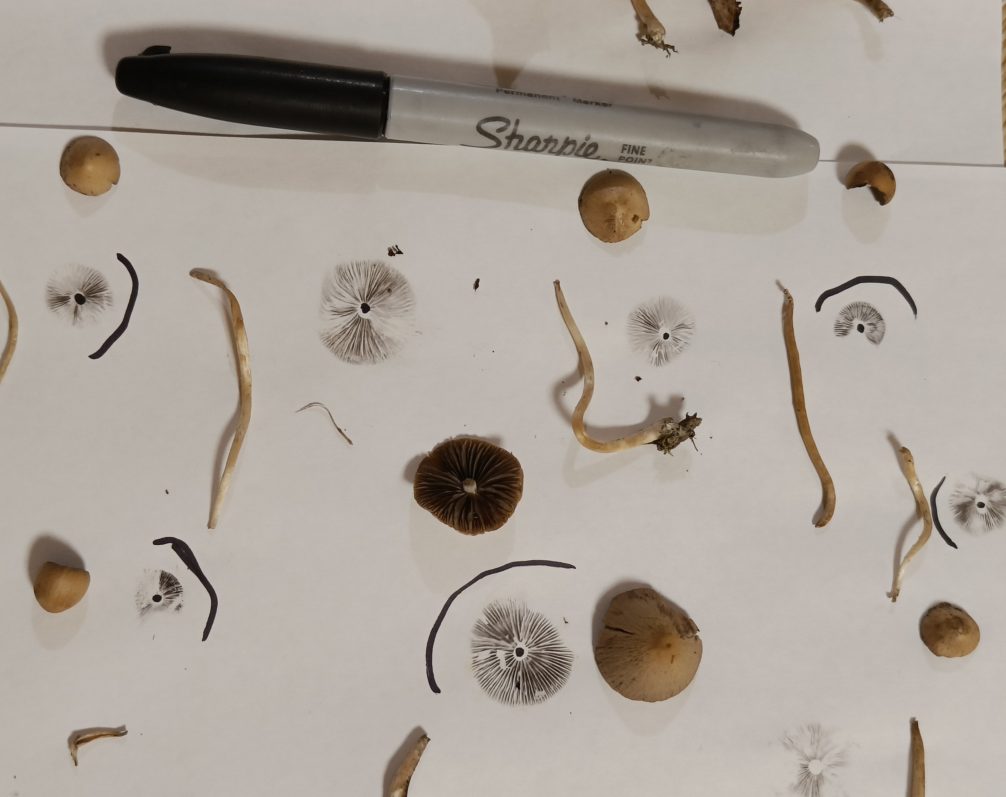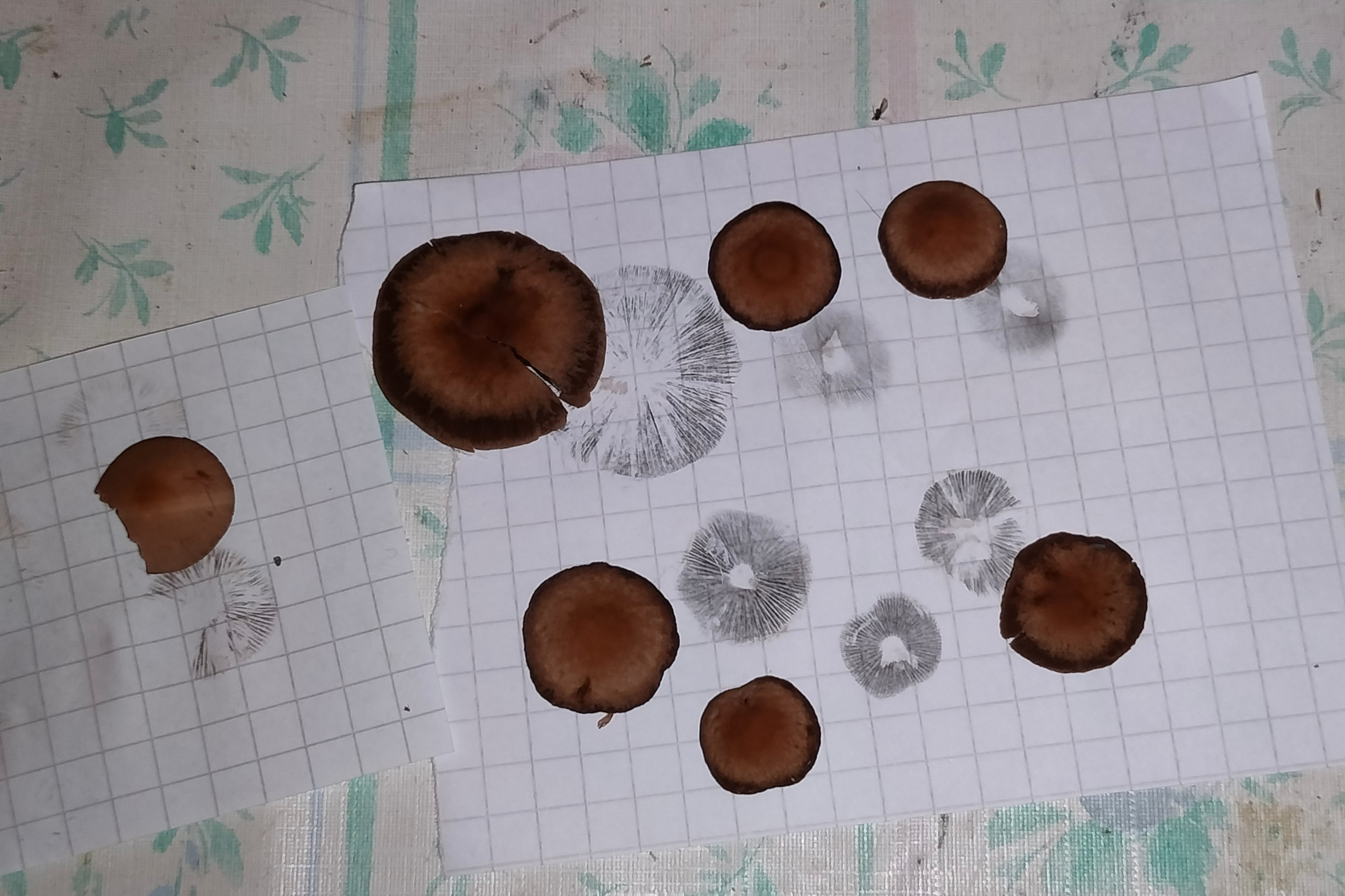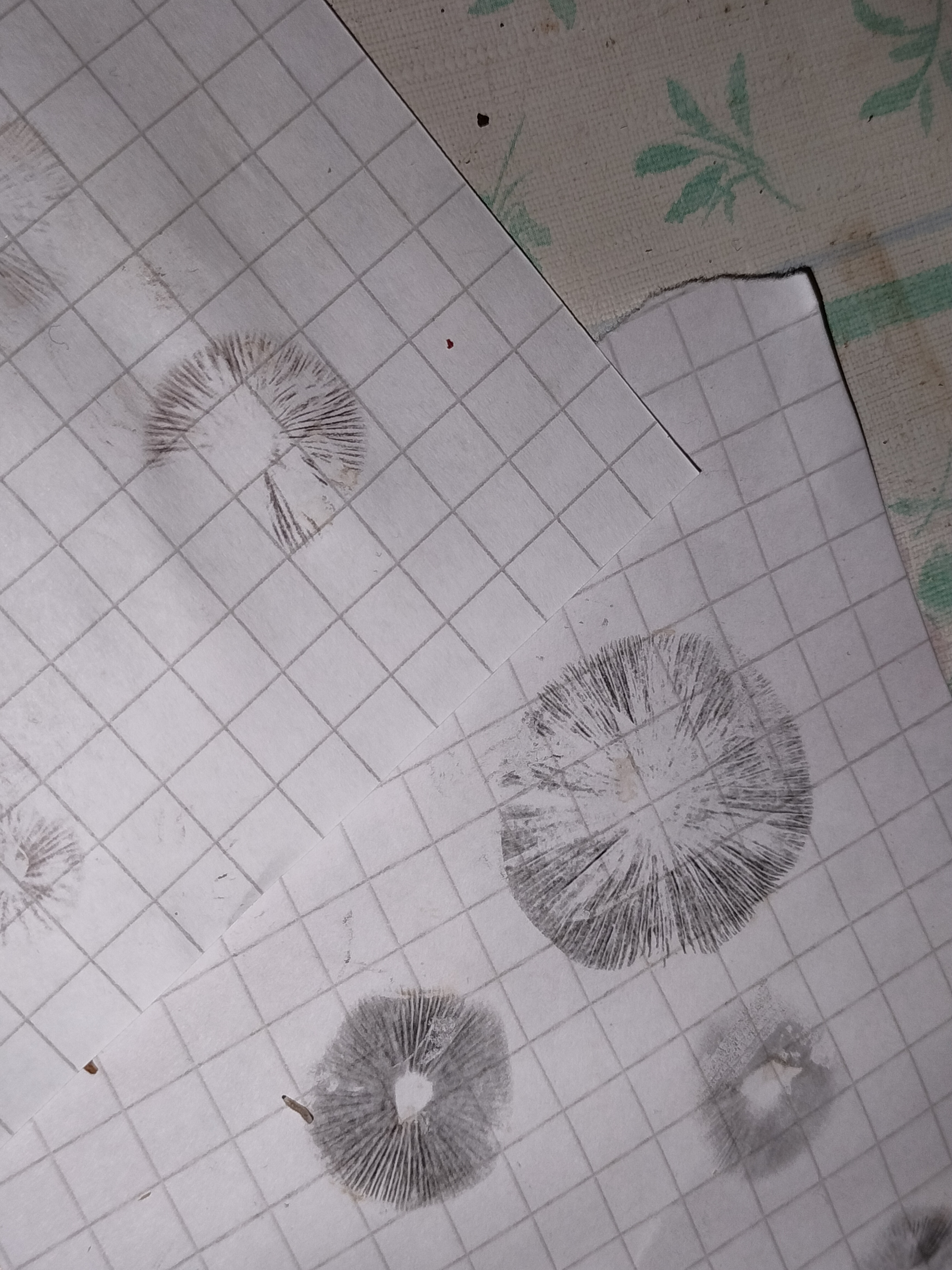Printtikuvissa mustalla sharpiellä piirretty piste keskellä eli aika mustalta näyttää. Suurin osa aika nuhjuisia ja huonokuntoisia sieniä, mutta paljon eri ikäisiä ja kokoisia sieniä samalla alle neliömetrin alueella. Isoimmissa ruskeissa ja mädissä yksilöissä oli lakki jopa ~3cm leveä, viimeisessä kuvassa.