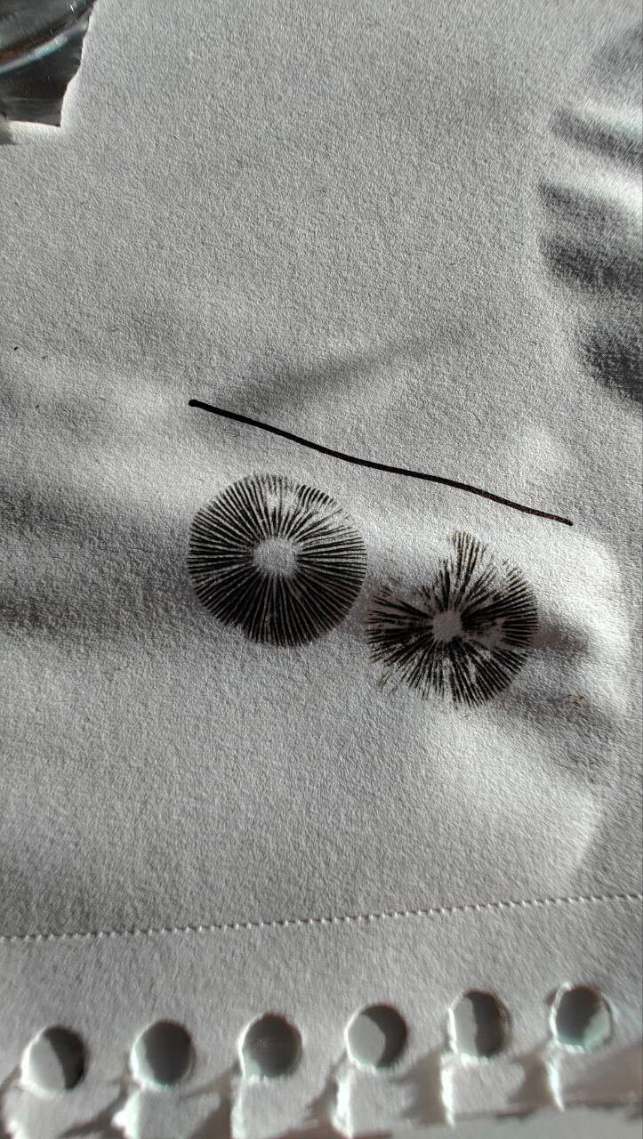 Tässä parit laskeumat, jotka maltoin antaa levätä 5-6h. Printtikuvissa vieressä viiva mustallapermanentilla ja luonnonvalossa otettu.