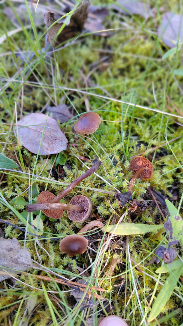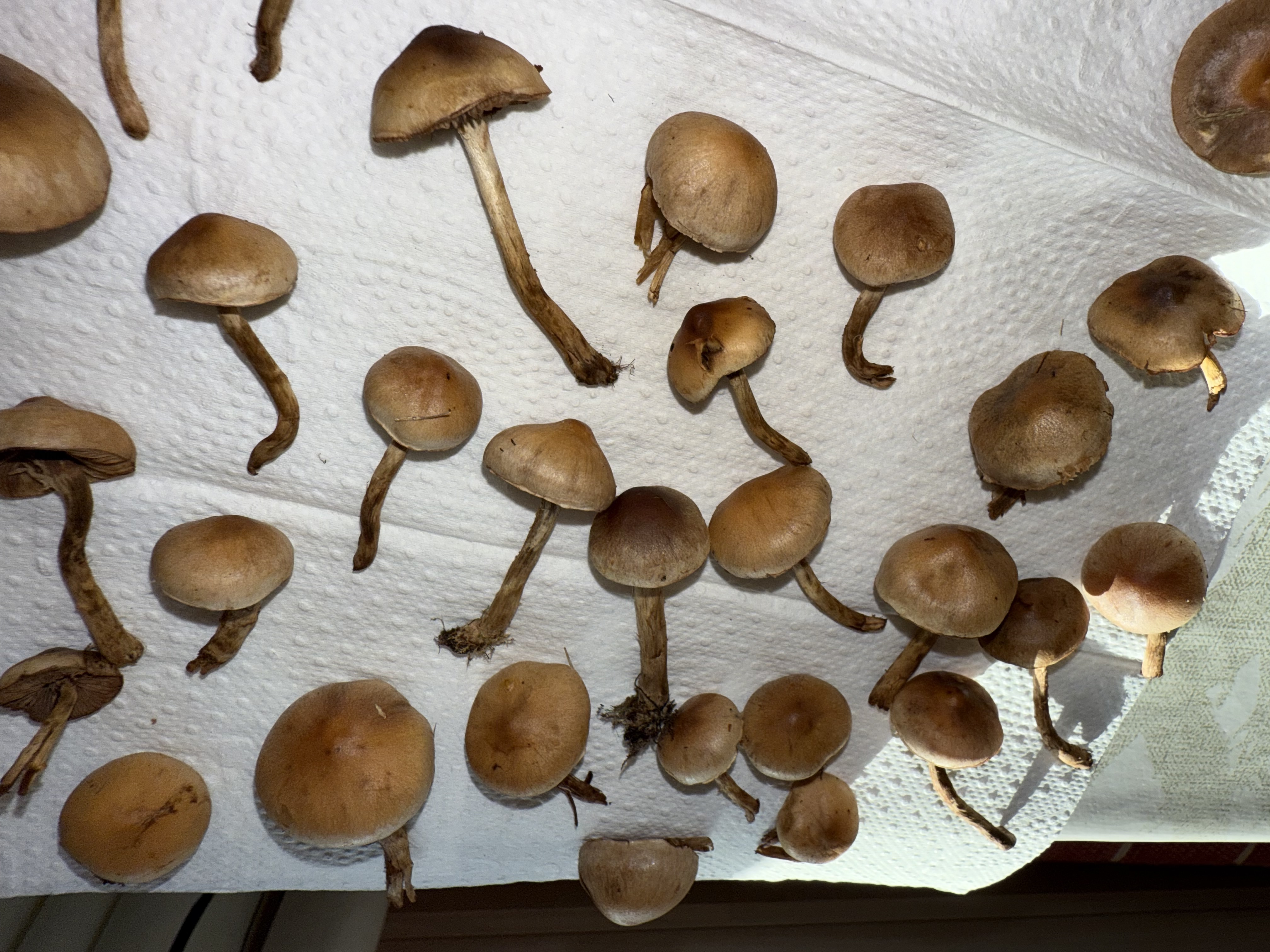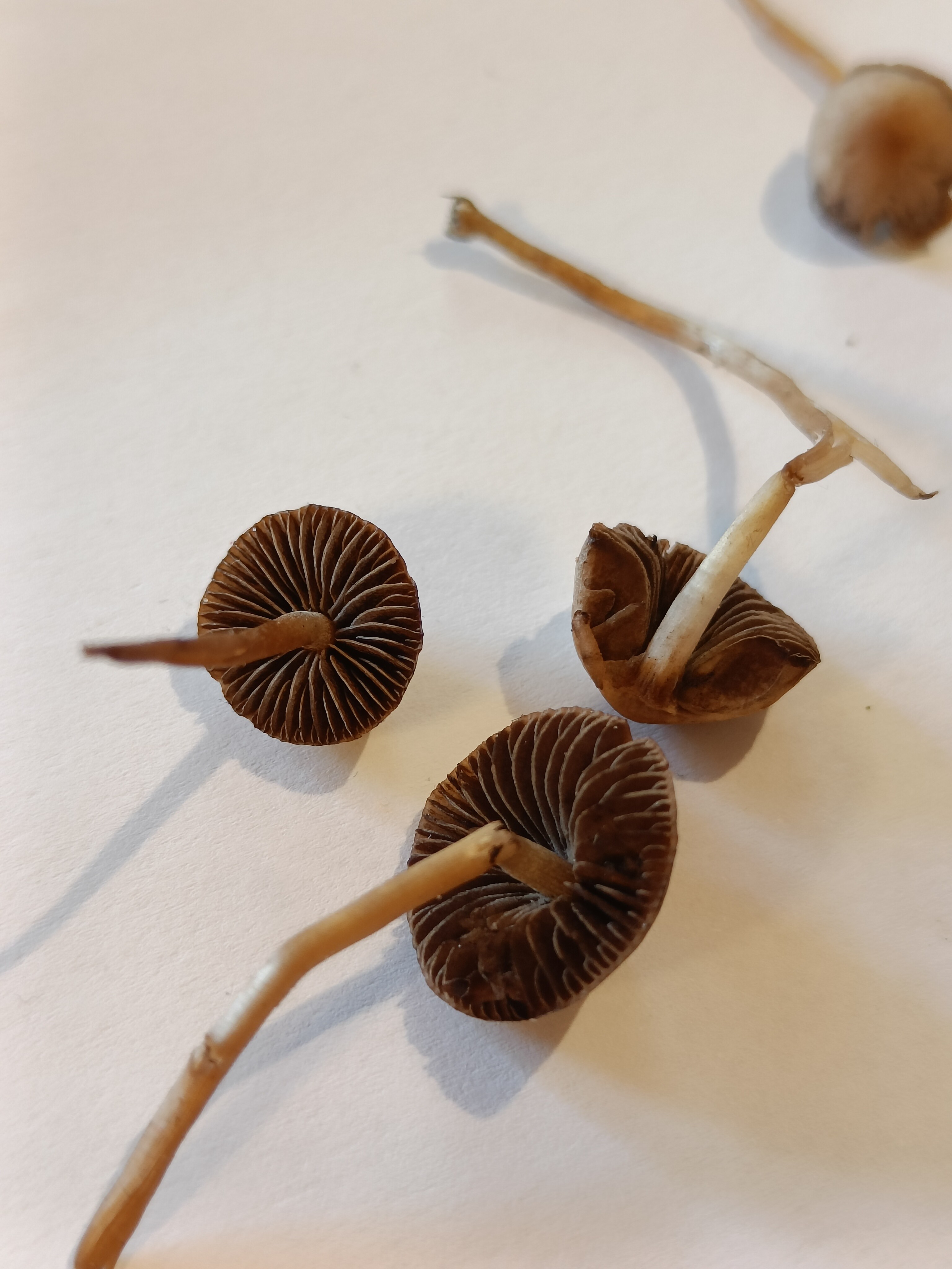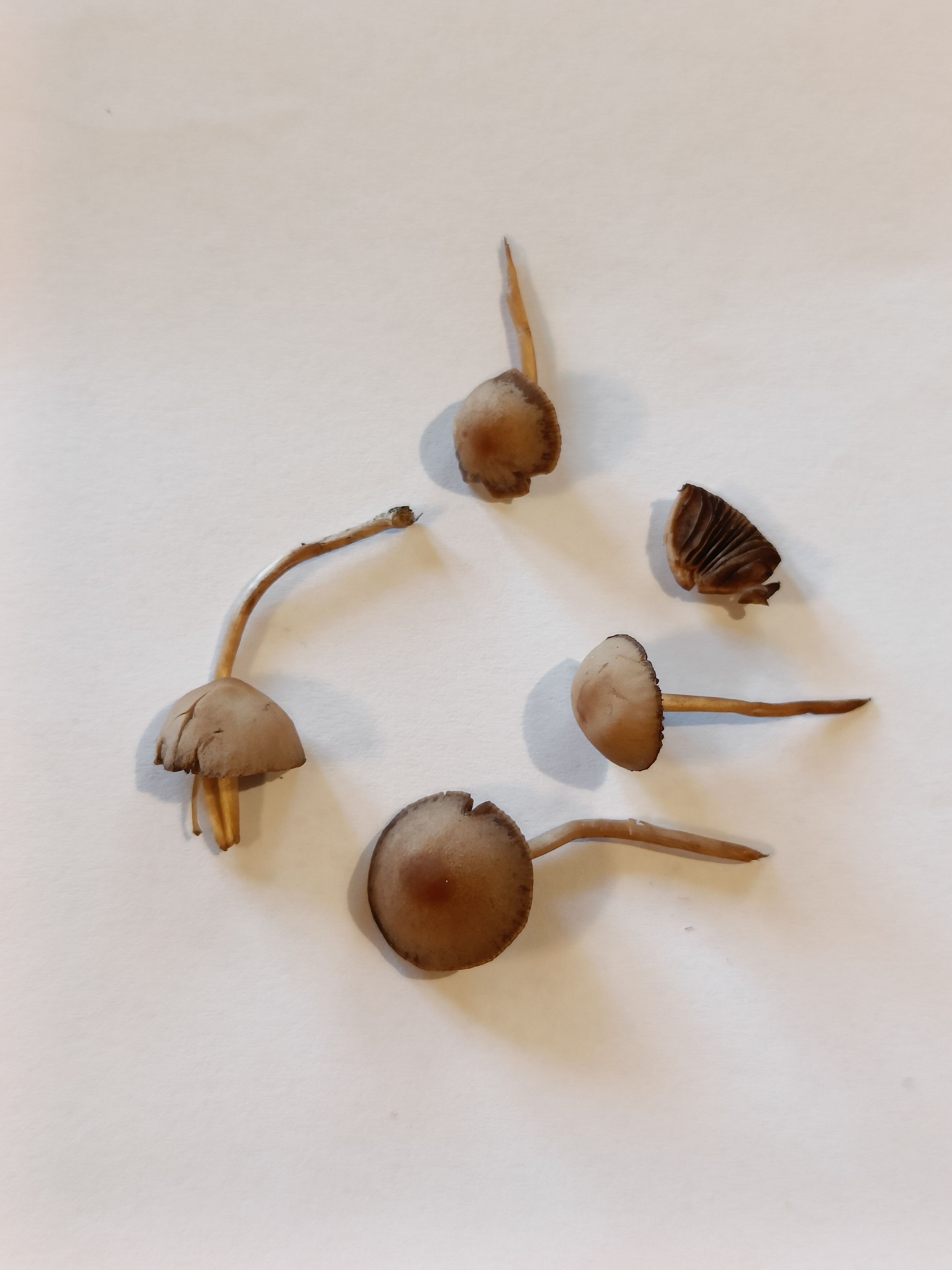 Mahtaako olla reunuskirjohelttoja tai jotain muita panaeoluksia? Lyhyeksi leikatulla kuivahkolla apilanurmella kaupunkialueella, potkin vahingossa nurin ohi kävellessäni ja alkoi mietityttää mitä olivat, siksi vähän huonossa kunnossa eikä luontokuvaa. Printti tosi tumma, käytännössä musta, kokemattomalla silmällä katsottuna ja paperille tehtynä.