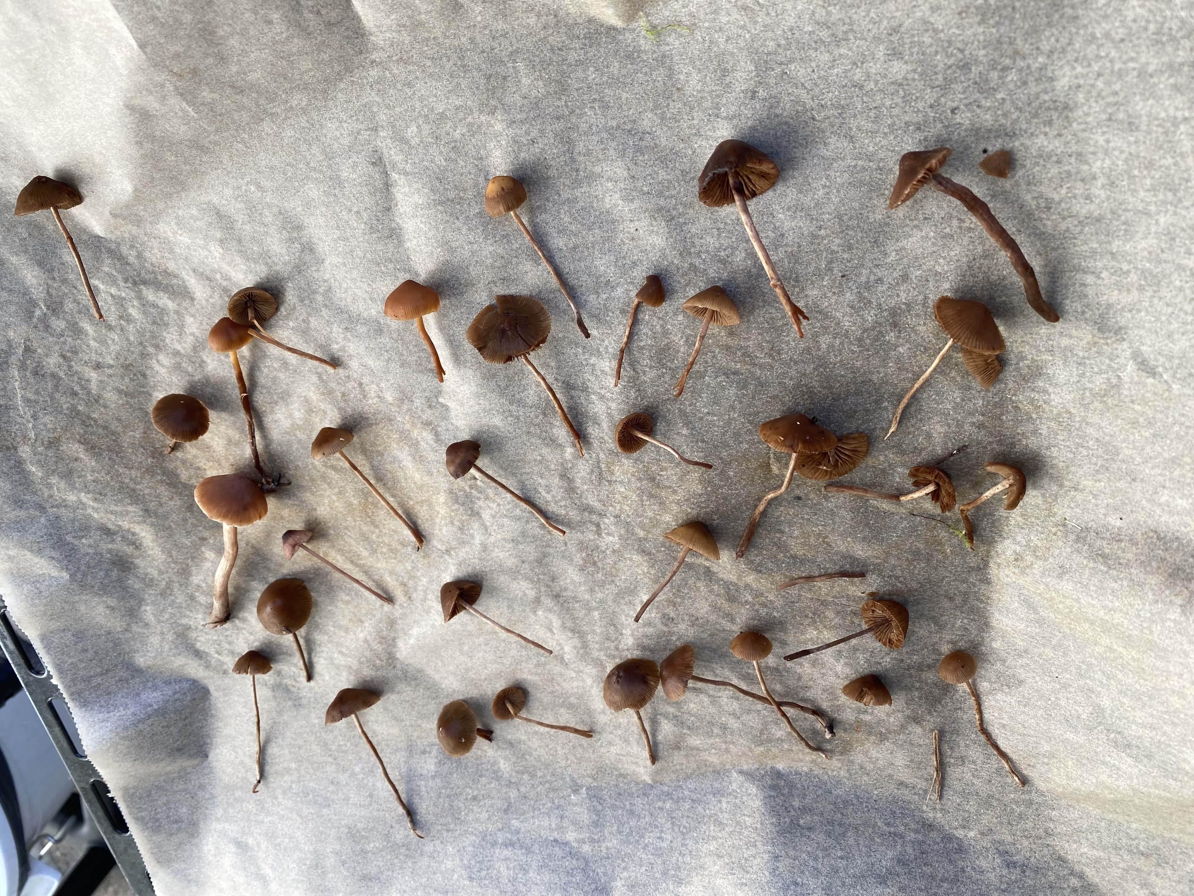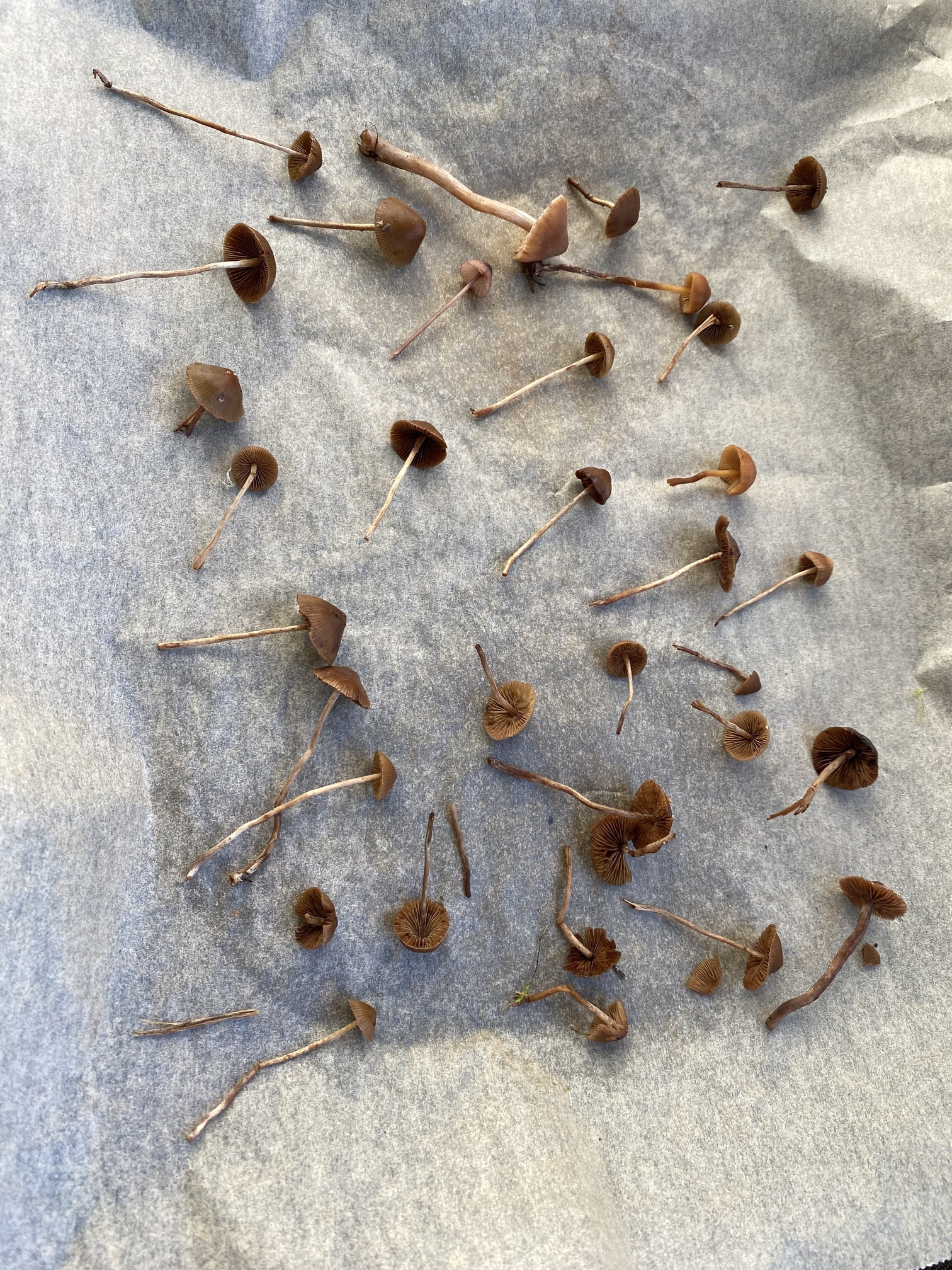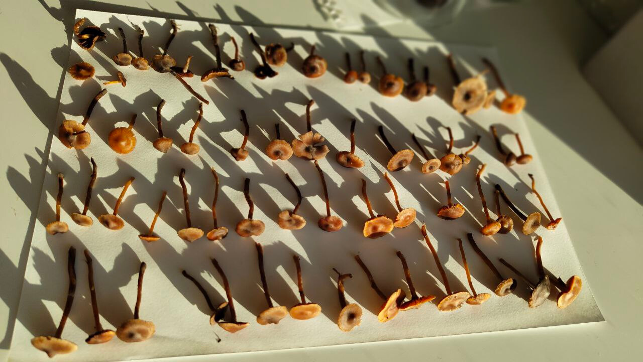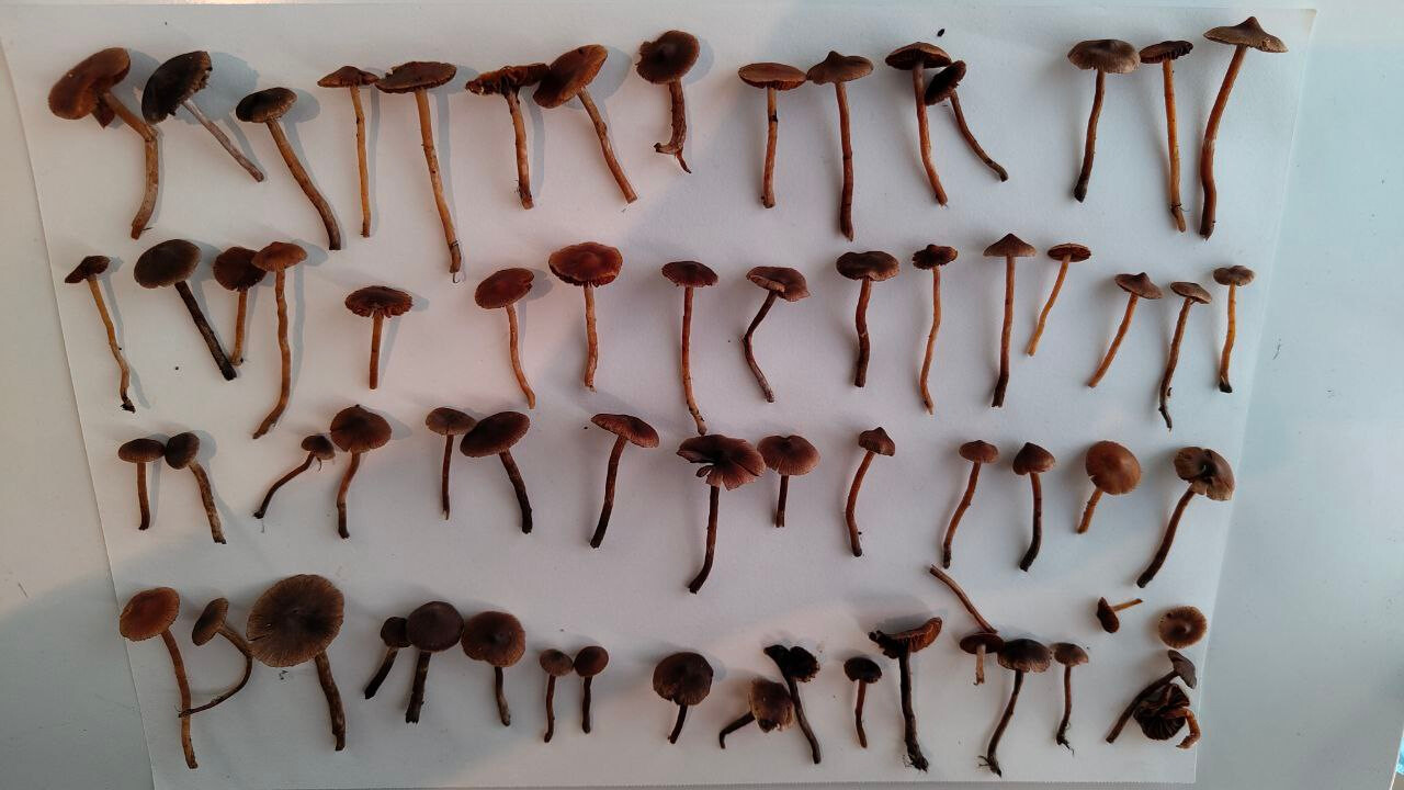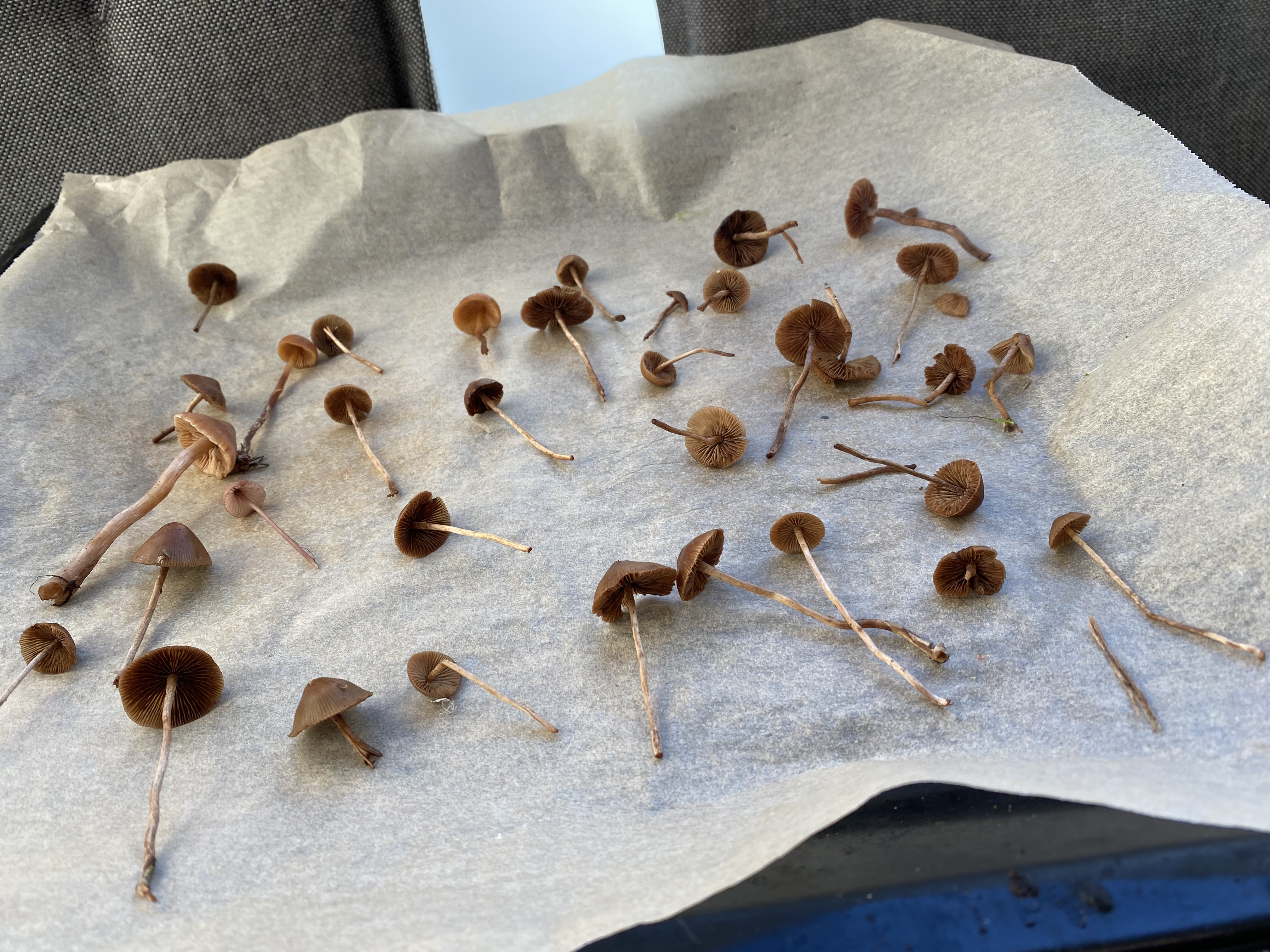 Mahtaako olla reunuskirjohelttoja tai jotain muita panaeoluksia? Lyhyeksi leikatulla kuivahkolla apilanurmella kaupunkialueella, potkin vahingossa nurin ohi kävellessäni ja alkoi mietityttää mitä olivat, siksi vähän huonossa kunnossa eikä luontokuvaa. Printti tosi tumma, käytännössä musta, kokemattomalla silmällä katsottuna ja paperille tehtynä.