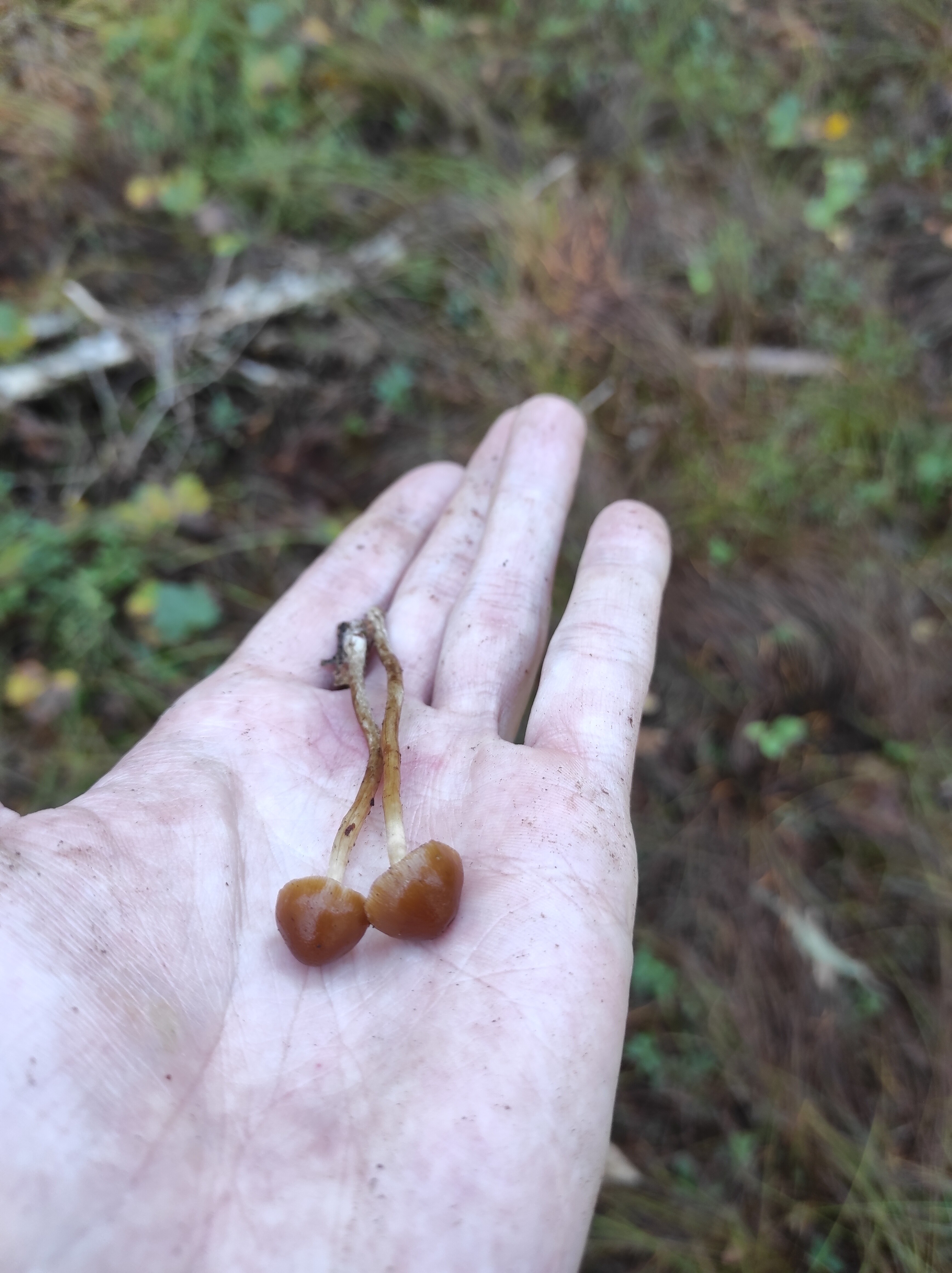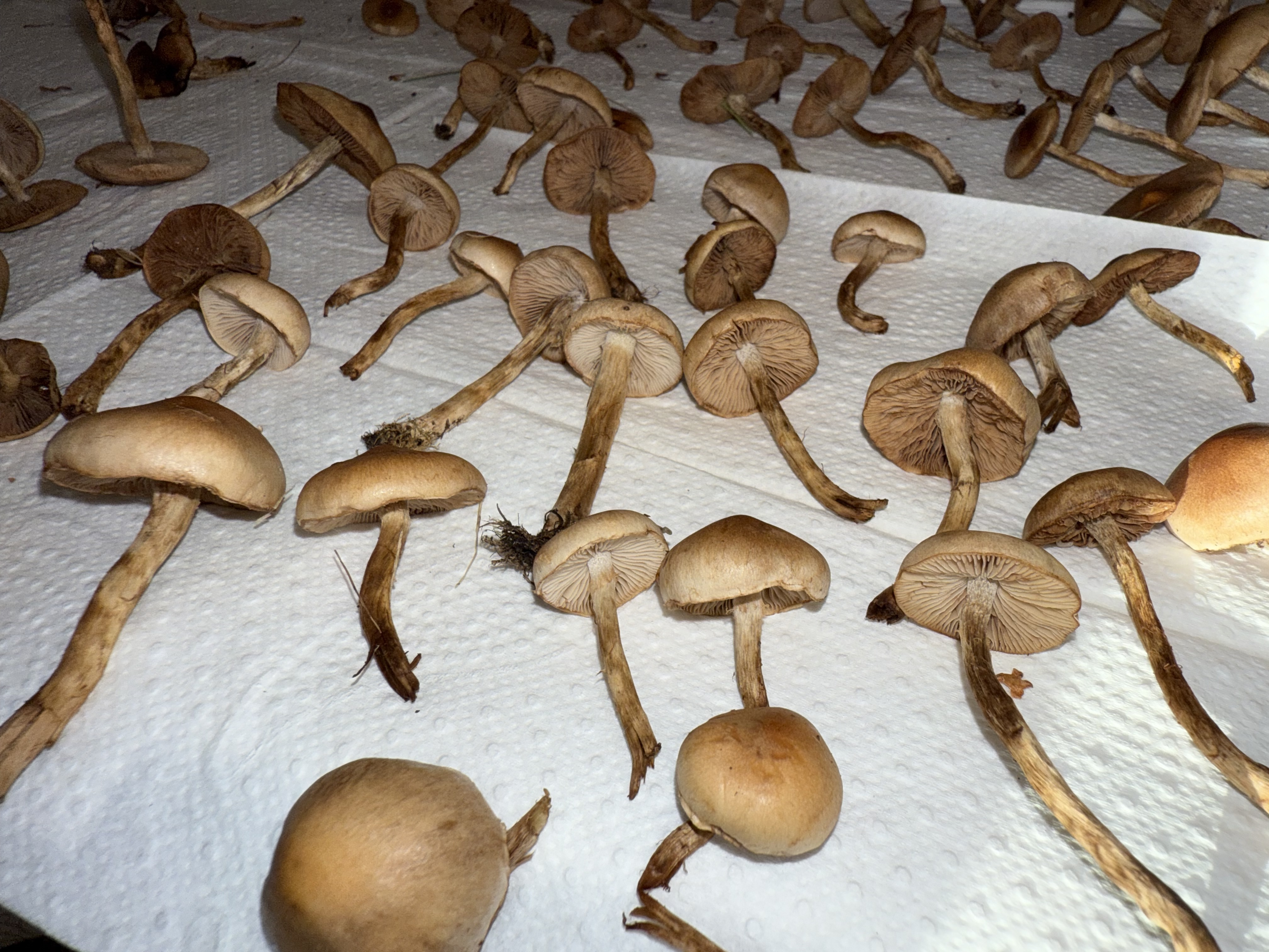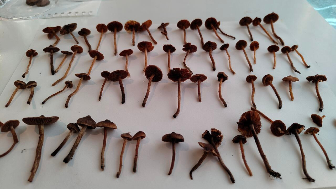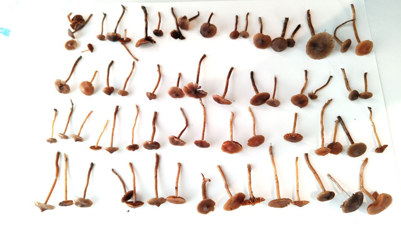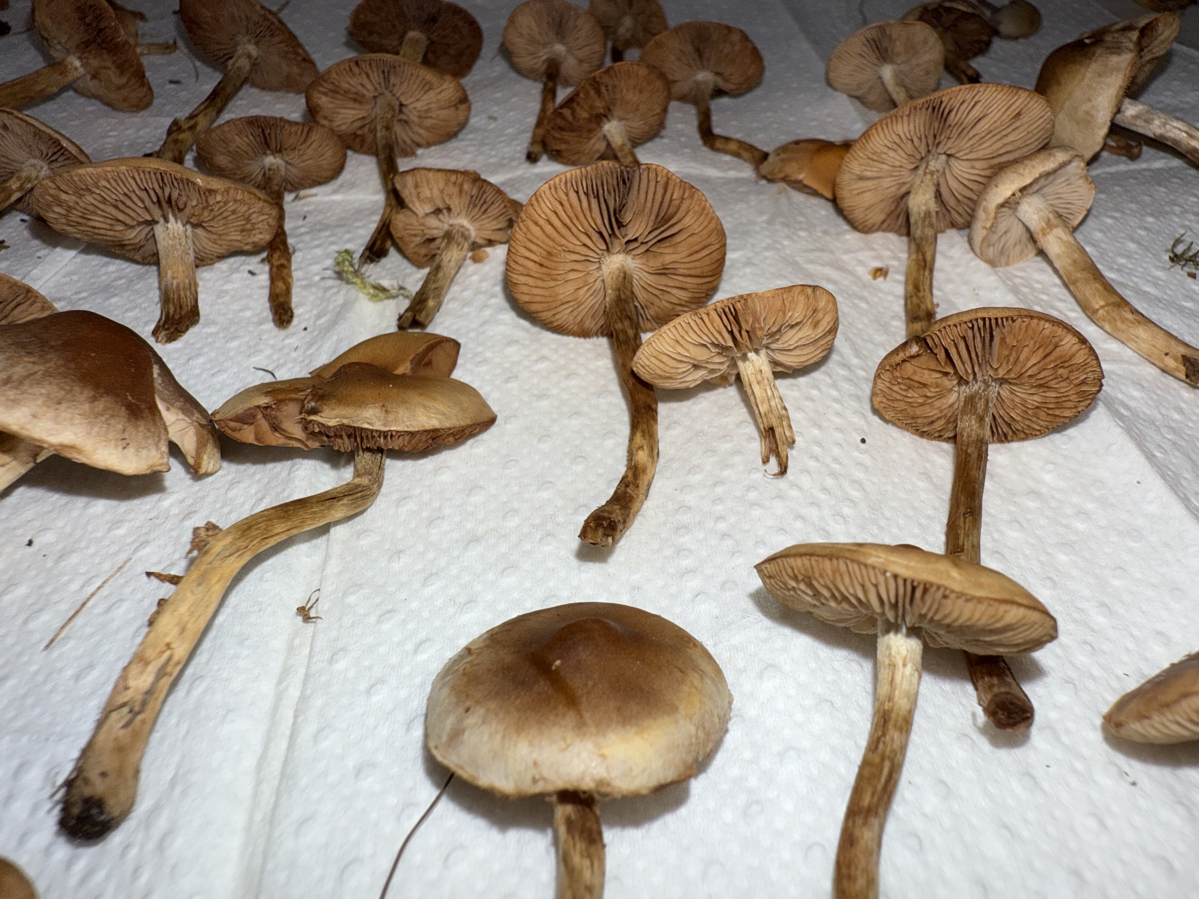 Mahtaako olla reunuskirjohelttoja tai jotain muita panaeoluksia? Lyhyeksi leikatulla kuivahkolla apilanurmella kaupunkialueella, potkin vahingossa nurin ohi kävellessäni ja alkoi mietityttää mitä olivat, siksi vähän huonossa kunnossa eikä luontokuvaa. Printti tosi tumma, käytännössä musta, kokemattomalla silmällä katsottuna ja paperille tehtynä.