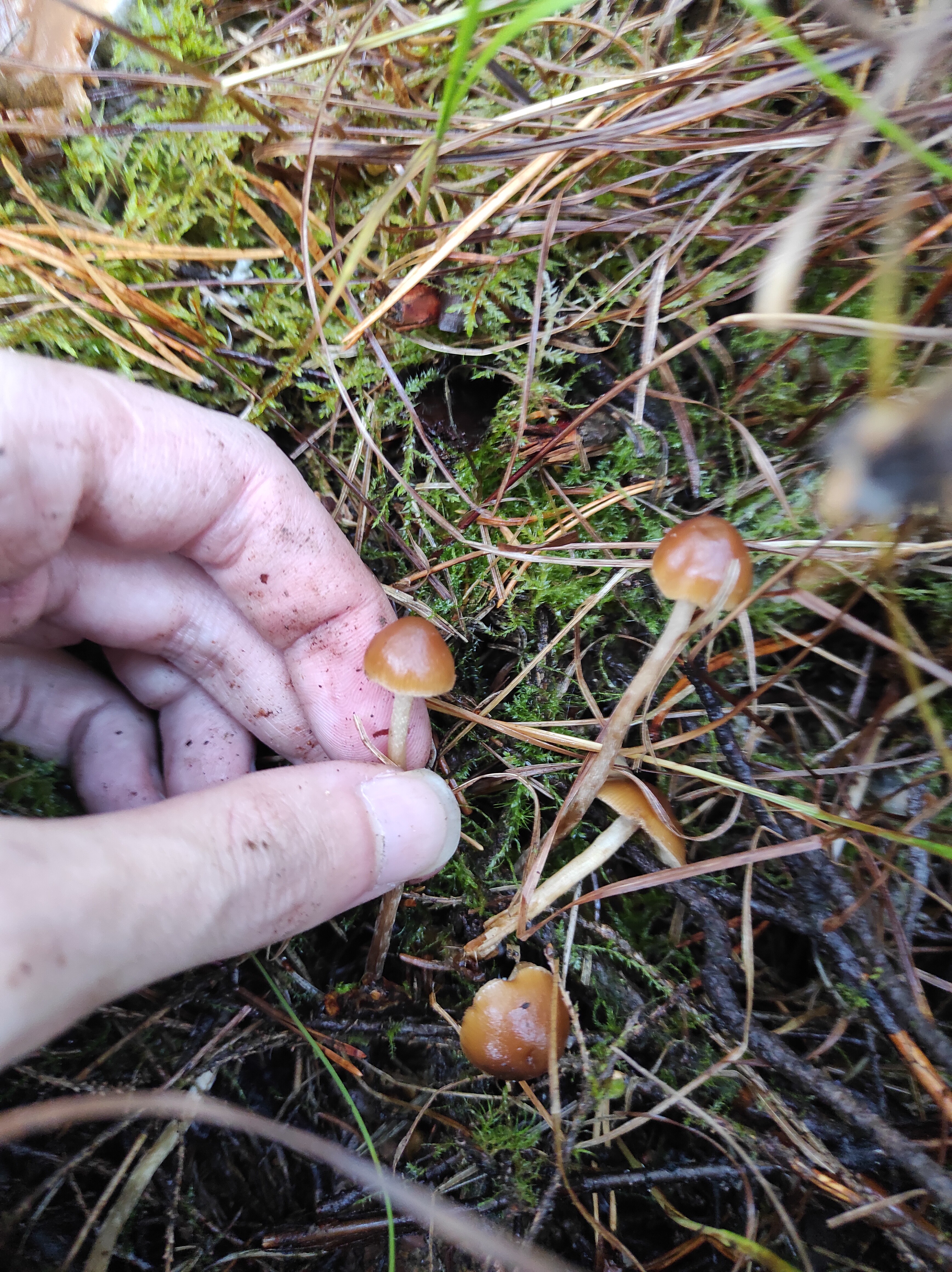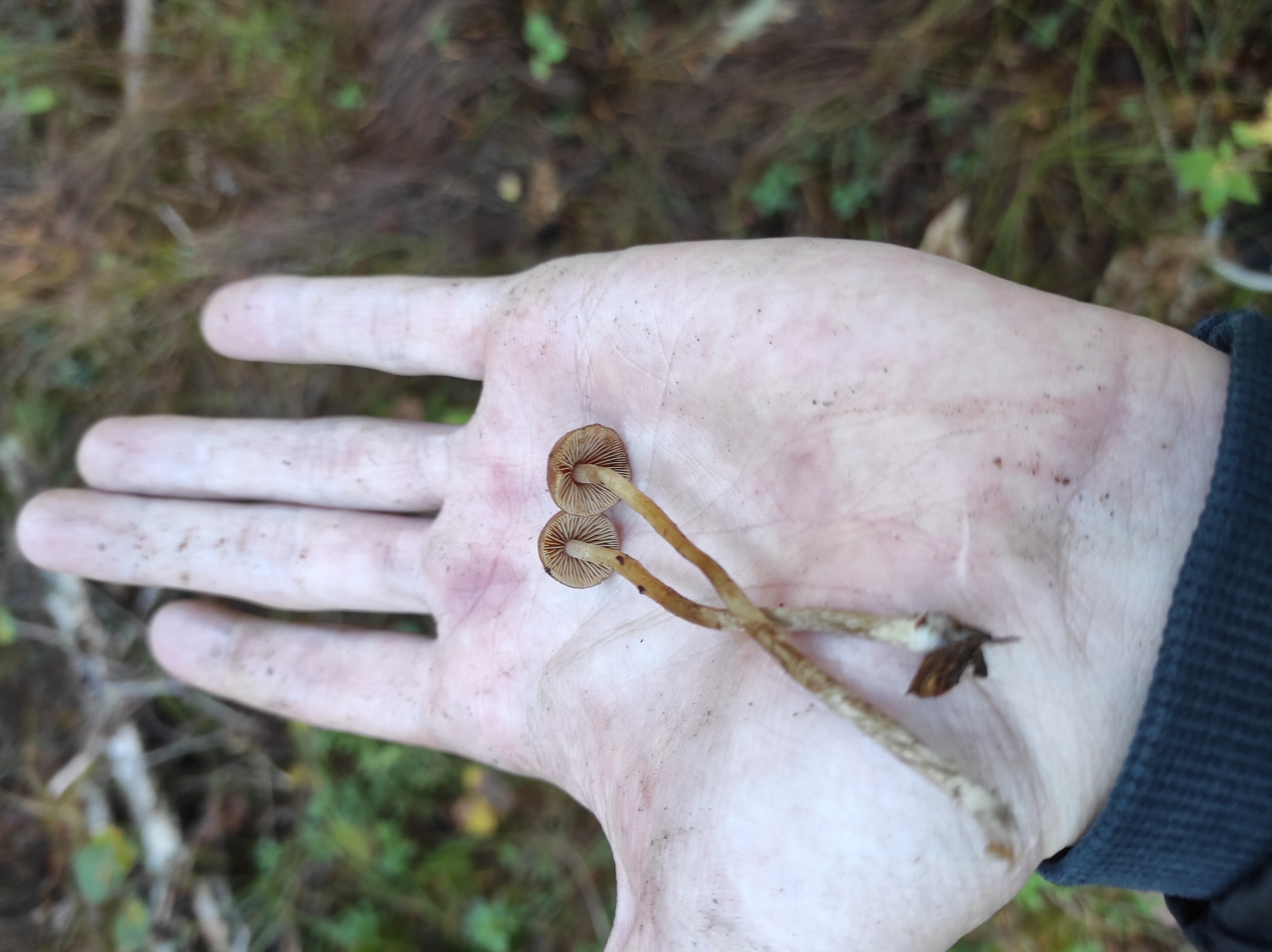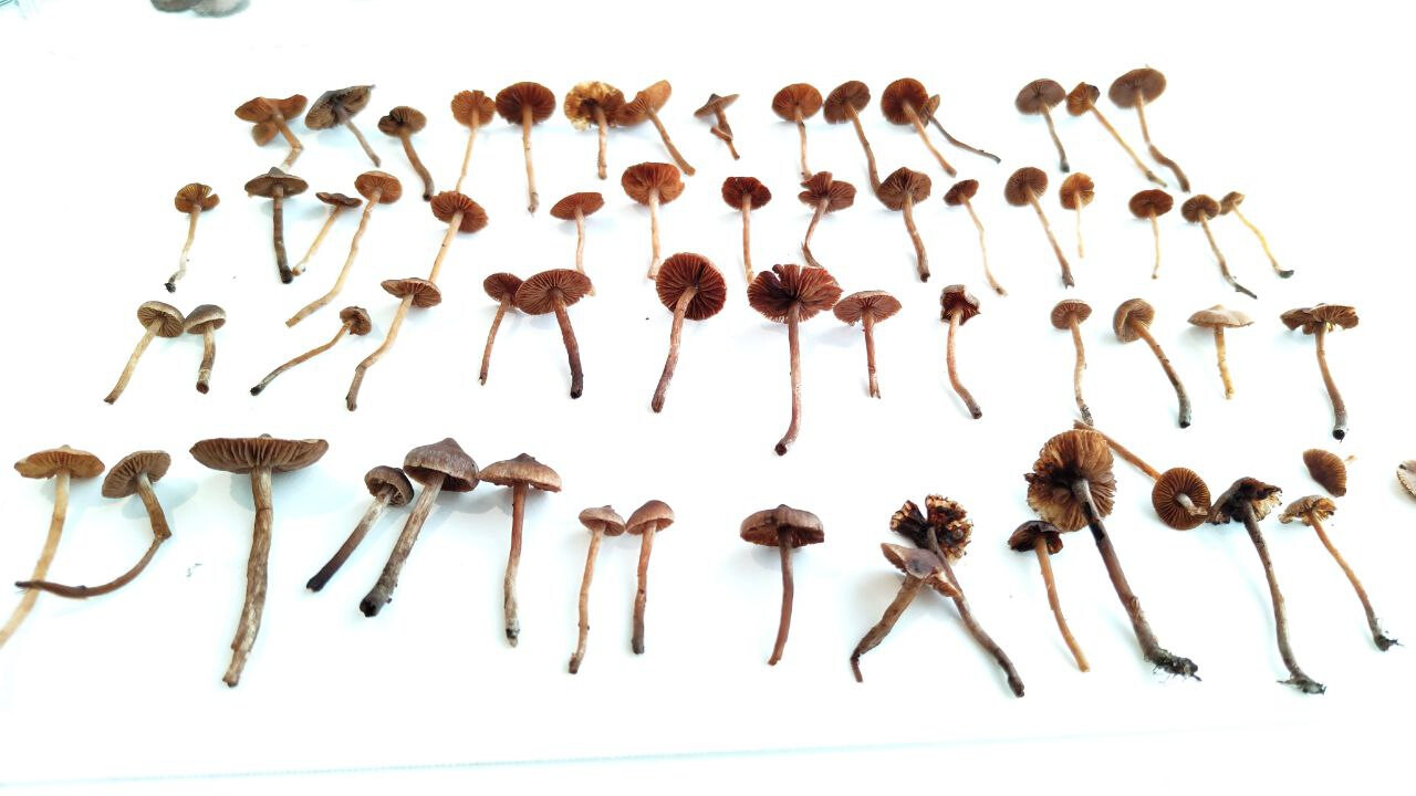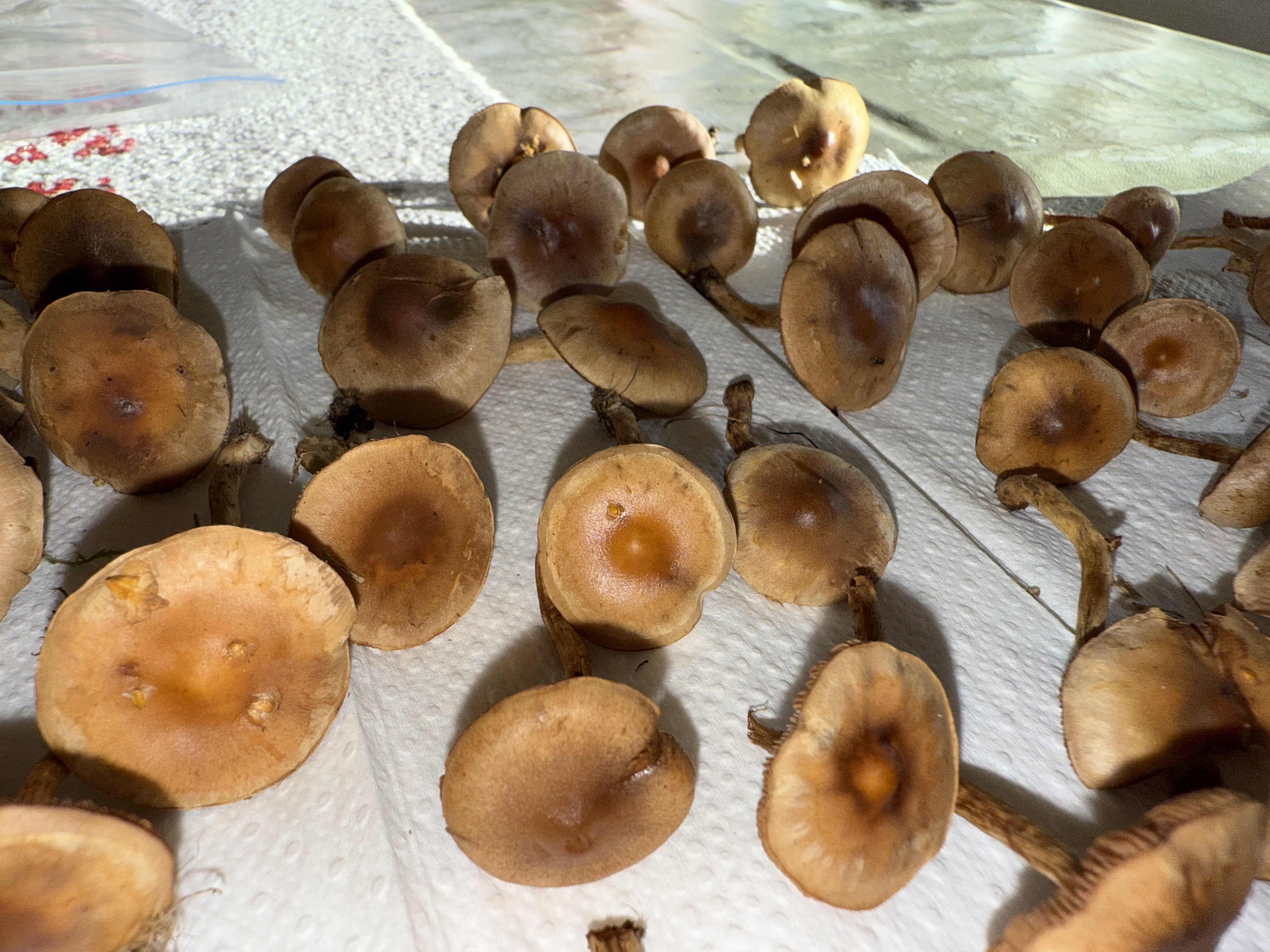 Mahtaako olla reunuskirjohelttoja tai jotain muita panaeoluksia? Lyhyeksi leikatulla kuivahkolla apilanurmella kaupunkialueella, potkin vahingossa nurin ohi kävellessäni ja alkoi mietityttää mitä olivat, siksi vähän huonossa kunnossa eikä luontokuvaa. Printti tosi tumma, käytännössä musta, kokemattomalla silmällä katsottuna ja paperille tehtynä.